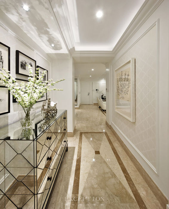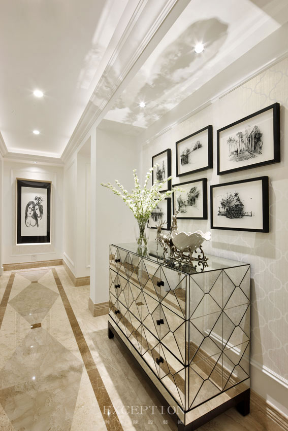 玄關只為一個空間的過渡,此處以仿雪花白大理石加玻璃鏡面體現效果,讓人忍不住流連與回顧。最喜墻面的簡潔的裝飾畫,形成不可或缺的道道風景。