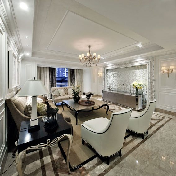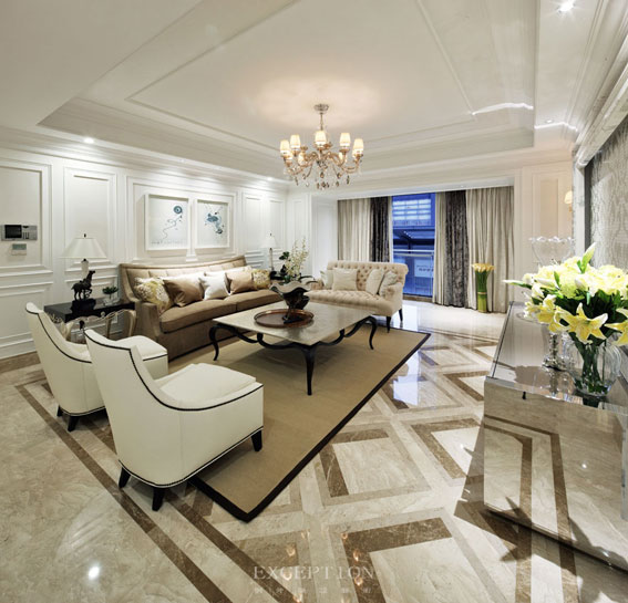 設計師以簡歐風格為主調,配合后現代主義美式家私的新古典元素,拋棄多余繁冗的堆砌裝飾,極力還原一個簡白亮麗的純色空間,米色加白色以及少量黑灰色彰顯極簡主義的凌厲果敢與美學韻致,大量使用仿雪花白白大理石、玻璃馬賽克、白色仿皮革質感的涂料等偏現代裝飾材質,符合時下現代人的審美視覺,目及手觸之處都是玲瓏一片純玉白。
