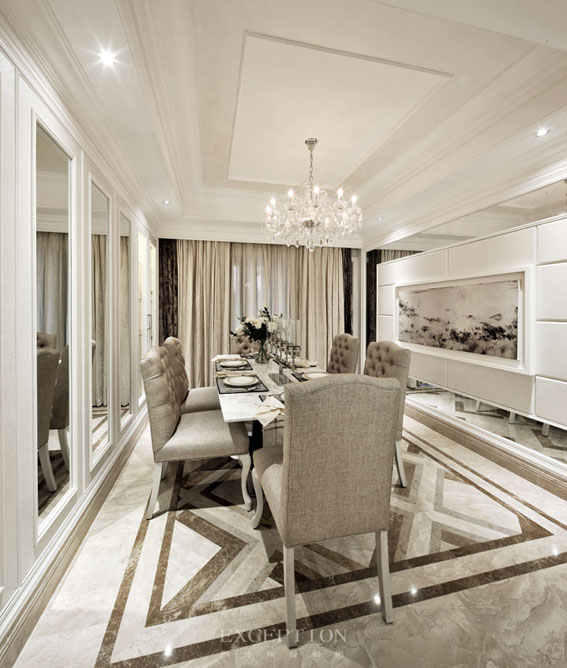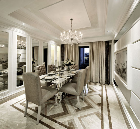 生活的姿態,可高貴端莊,亦可簡潔淡雅,能同時擁有堪稱完美。客廳以米白和咖啡色為主調,極簡的天花和墻面恰到好處地拉伸了視覺,與亮麗的格棱狀地板相呼應,營造出一個寬大舒適的空間。捧一本好書,配一杯香醇的奶茶、聽一支美妙的曲子,懶懶靠在細軟的沙發上,任水晶吊燈灑下的暖光滿溢,隨意、溫馨、優雅的情調絲絲蔓延。