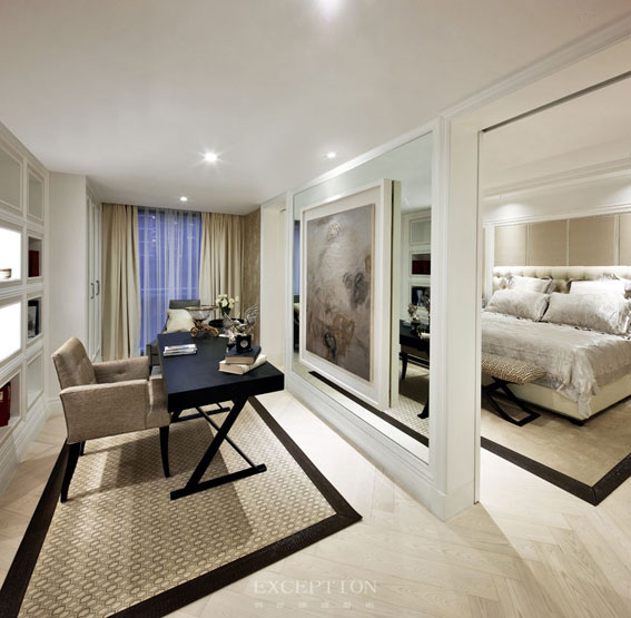 鏡面和木飾面相結合的設計手法,避免了木飾面的沉悶和玻璃的冰冷感,增強空間的靈動欣悅。軟裝飾品搭配得較細致,以溫馨的格調為主,當陽光造訪,又會生出別樣的情韻。