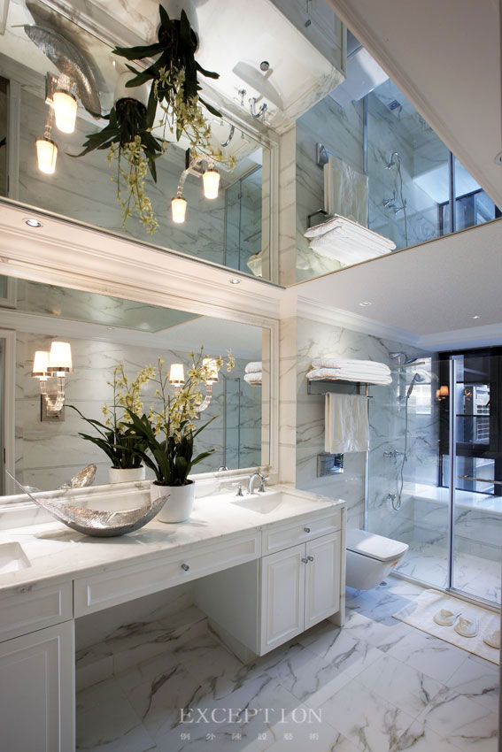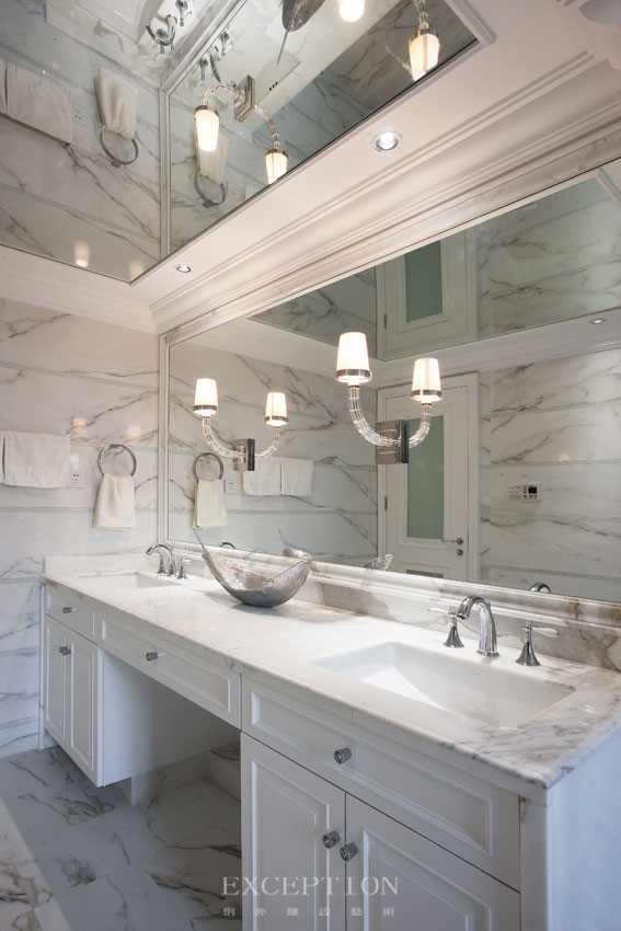 仿雪花白大理石加馬賽克裝飾有一種說不出道不明的通透純粹的美感,繁囂塵世中這是一方透明澄澈的空間,洗滌塵埃,放空自己,快樂來得比想象中的還要簡單透明。